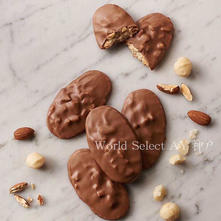 サクサクの食感に焼き上げたサブレにナッツをのせ、クーベルチュールのミルクチョコレートでコーティングしました。