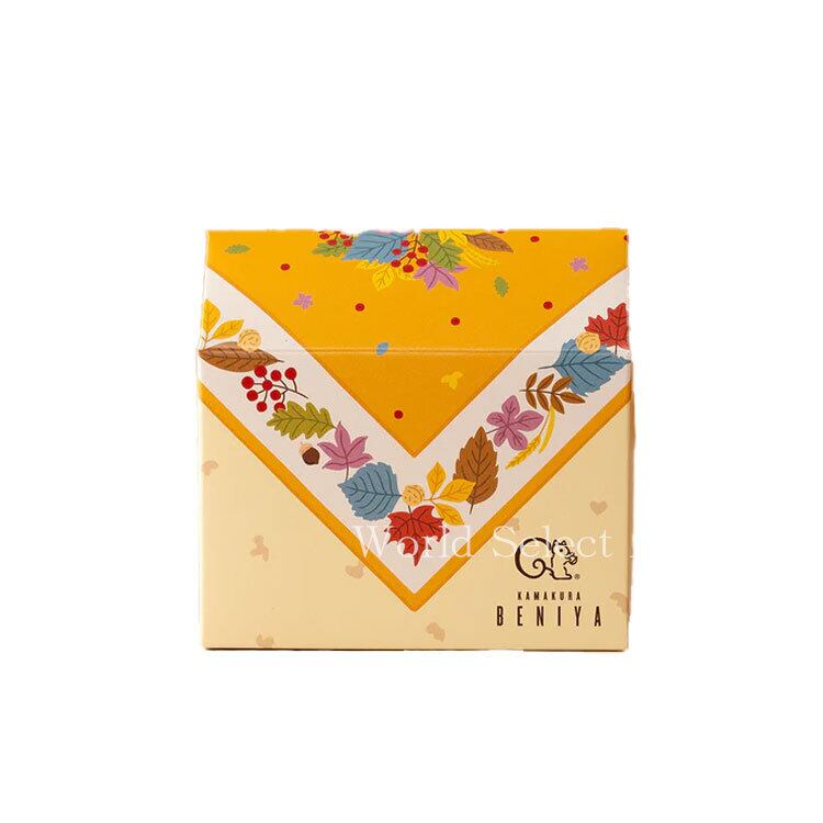 色とりどりの葉や木の実を描いたスカーフが、さわやかな秋風にのってハウス型BOXに舞い降りたようなデザインです。