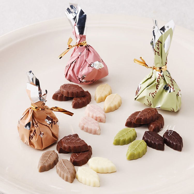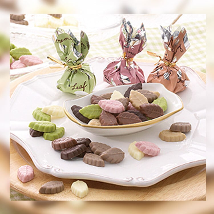葉っぱの形のプチチョコレート。1包みで3つの風味が楽しめます。橙(ミルク・ホワイト・モカ)緑(ミルク・抹茶・ダーク)桃(ミルク・クランベリー・キャラメル)合計70個