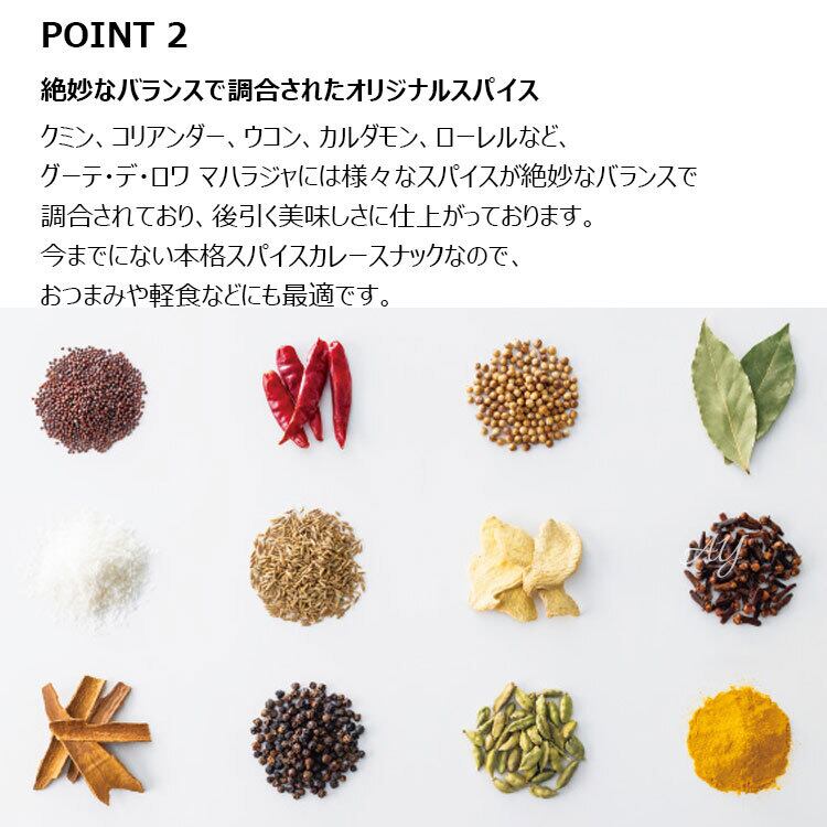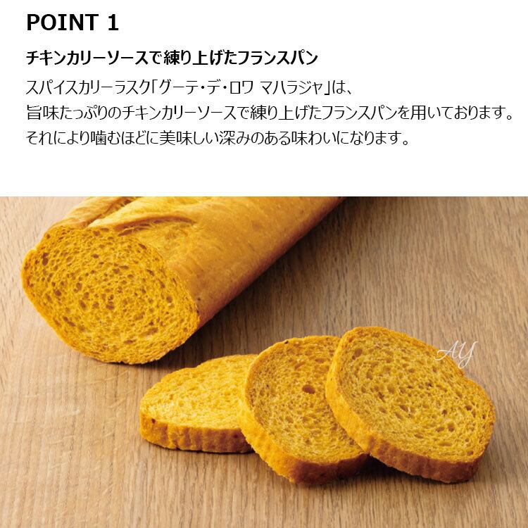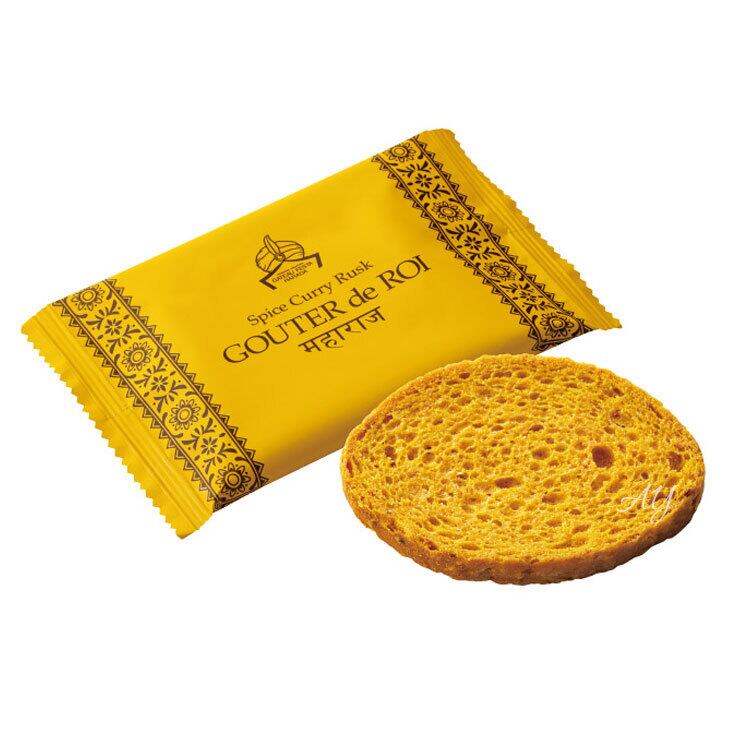 スパイスカリーラスク「グーテ・デ・ロワ マハラジャ」は、スパイスカリーを練り込み、旨味を閉じ込めたフランスパンを用います。その専用フランスパンをスライスし、バターをかけて焼き上げ、最後にオリジナルスパイスをふりかけてスパイスカリーラスクに仕上げました。スパイスカリーの持つ旨味と、様々な香辛料が織りなす香りをご堪能ください。