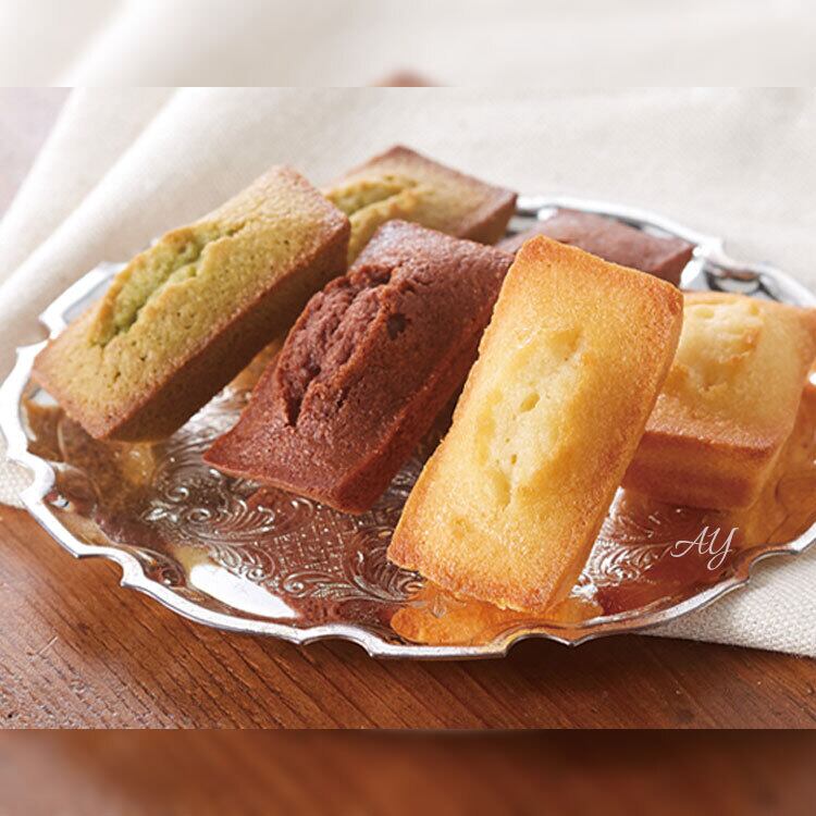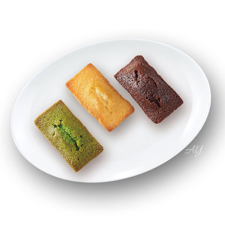 チョコレート・抹茶・プレーンの3風味。 香ばしいアーモンドと、フィナンシェ独特の焦がしバターの苦みを、とっても美味しいプチフィナンシェに仕上げました。
